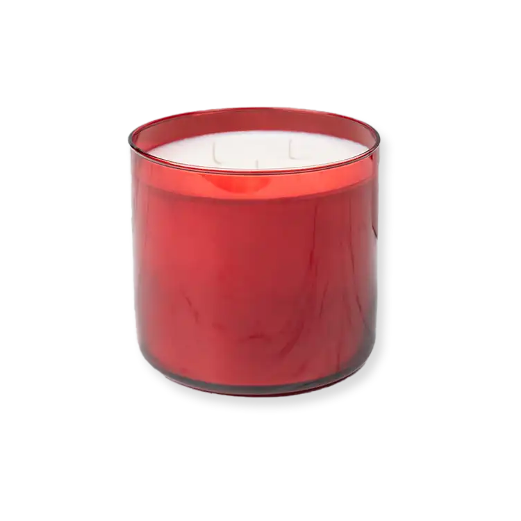 17 oz red glass jar with 2 wicks (branding on bottom only). Gold lid. Burns approximately 45-50 hours.